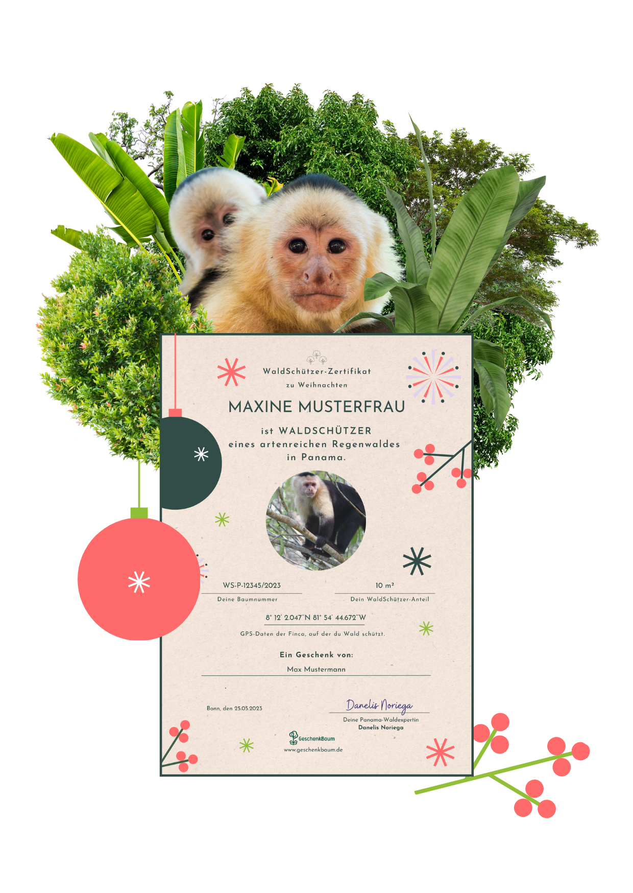 Mit dem WaldSchützer-Produkt kannst du denSchutz von wertvollem Regenwald in Panama übernehmen. Für nur 1,00 € pro m² (ab 10 m²) erhältst du ein personalisiertes, digitales Wald-Zertifikat als PDF, GPS-Daten der Fläche, auf der dein Wald wächst, und 50 Jahre garantierten Waldschutz. Der Regenwald „Los Monos“ an der Pazifikküste Panamas ist Heimat für Kapuzineraffen, Faultiere und viele andere Arten. Jeder Quadratmeter bindet rund 19 Kilo CO₂ und leistet damit einen wichtigen Beitrag zum Klimaschutz.